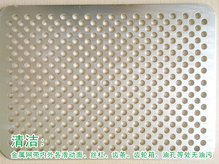 金屬網帶內外各滑動面、絲杠、齒條、齒輪箱、油孔等處無油污,各部位不漏油、不漏氣,設備四周地切屑、雜物、臟物機械工程師要清掃干凈;