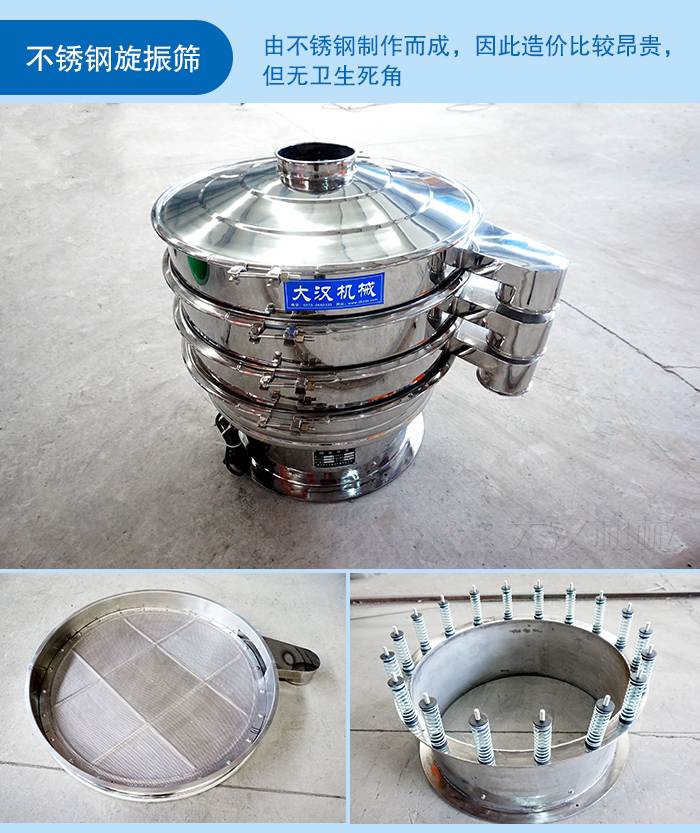 這種旋振篩無論是進出料口還是彈簧機座,全部都是由不銹鋼制作而成,因此造價比較昂貴,但無衛生死角,非常適合一些對衛生要求比較嚴格的物料篩分。并且不銹鋼材質分好多種:有201、202、304、316、316L等類型。201、202的不銹鋼材質只是比普通鋼材好了一點點,是在不銹鋼材質中質量差的一種,如果是用在旋振篩上用不了多久就會生銹的。304材質的不銹鋼為普通的不銹鋼,這種不銹鋼板旋振篩常用的類型。這種材質的鋼板跟201、202材質相比性能優良不少。316、316L類型的不銹鋼為比304更好一點的材質,通常是用在強酸強堿行業。這些行業對旋振篩的材質要求十分嚴格,316L型的不銹鋼則比316型的更好。