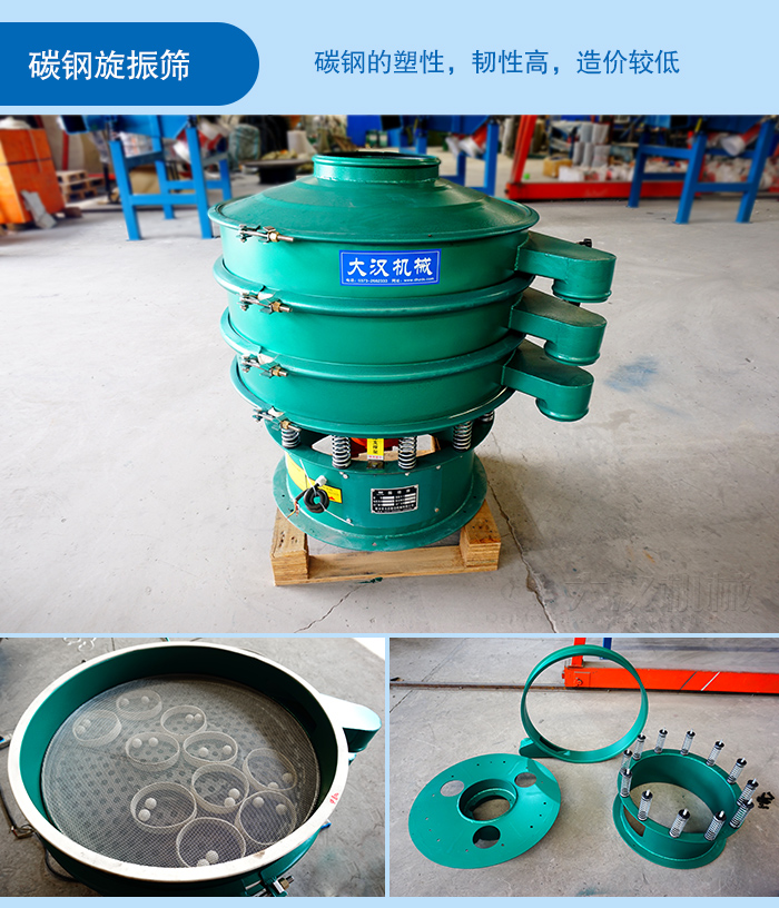 對于那些對衛生沒有要求的普通物料,碳鋼旋振篩是物美價廉的選擇。一般碳鋼中含碳量越高則硬度越大,碳鋼的塑性,韌性高,焊接性能好、可鍛可沖壓性好、成本低、性能范圍大,這些優良的特性足夠支撐日常旋振篩的操作。為重要的是,碳鋼造價較低,如果所篩物料對旋振篩材質無特殊要求,那么碳鋼是您的不二之選。