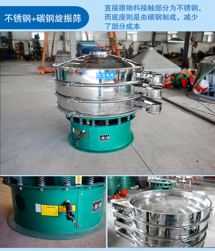 這種旋振篩的機身是不銹鋼材質,用于直接跟物料接觸,而底座則是由碳鋼制成,減少了部分成本。這種材質的旋振篩價格比不銹鋼便宜,比碳鋼稍貴。適用于一些對衛生要求不是很嚴格的物料。