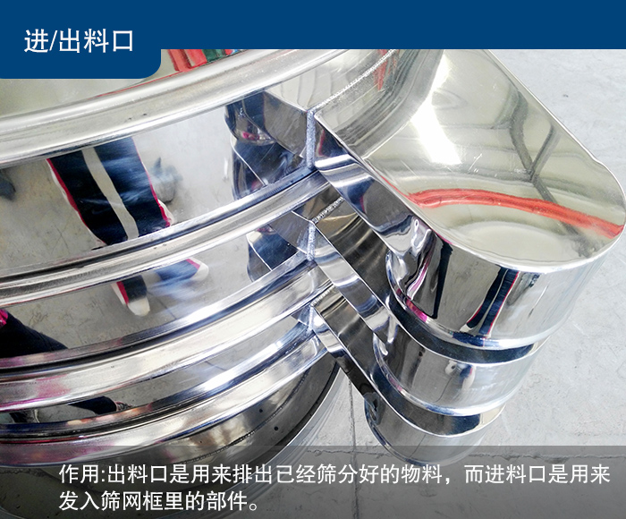 進(jìn)/出料口是較為簡(jiǎn)單的旋振篩結(jié)構(gòu),出料口是用來(lái)排出已經(jīng)篩分好的物料,而進(jìn)料口是用來(lái)發(fā)入篩網(wǎng)框里的部件。