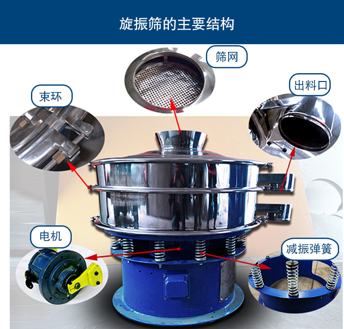 旋振篩的主要結(jié)構(gòu)由:減振彈簧,電機(jī),彈跳球,篩網(wǎng),防塵蓋,大/小束環(huán),進(jìn)/出料口。